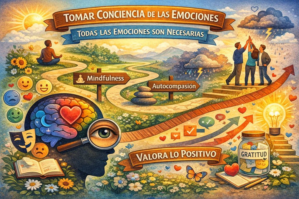 Tomar conciencia significa conocer las emociones que existen y reconocer las que tenemos en cada momento. Uno mismo y las personas que nos rodean. Teniendo claro una máxima: “las emociones no son buenas o malas, son todas necesarias”. Unas nos son agradables y otras no, pero todas necesarias.