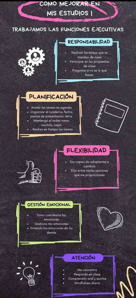 Te aportamos una infografía de cuáles son y cómo trabajar las funciones ejecutivas del cerebro. Y te sugerimos una web maravillosa con recursos sobre esta temática del ENCUENTRO de PROFESIONALES de PT-AL-ORIENTACIÓN de los centros educativos de las zonas de actuación de los EOEs de Mairena del Aljarafe y Castilleja la Cuesta