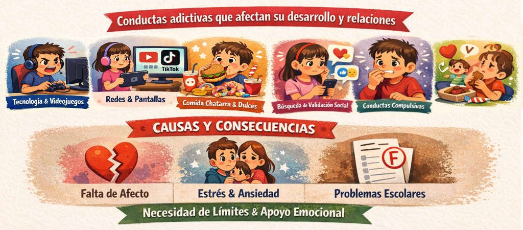 Las adicciones o conductas adictivas en niños en edad escolar incluyen principalmente el uso excesivo de tecnología como videojuegos, teléfonos móviles, televisión y redes digitales, así como la dependencia a alimentos azucarados y ultraprocesados, la búsqueda constante de validación social y ciertas conductas compulsivas relacionadas con la ansiedad, las cuales pueden afectar su rendimiento escolar, su desarrollo emocional y sus relaciones sociales, y suelen estar vinculadas a la falta de límites, al manejo inadecuado de emociones o a necesidades afectivas no atendidas.